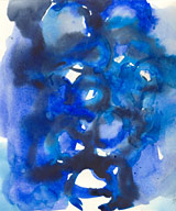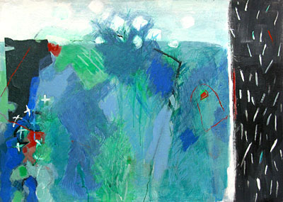 Weitere Materialien treten hinzu: collagierte Zeitungs- und Buntpapierschnipsel sowie intensive oder feinste Tusche- oder Farbstiftlinien und –flächen.